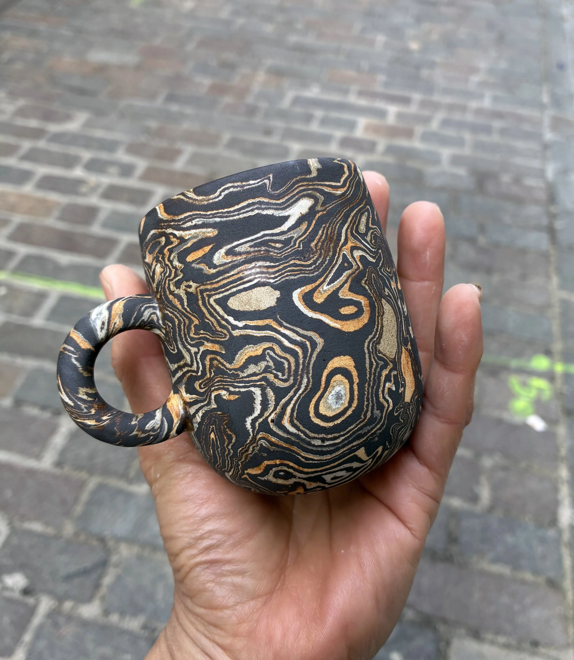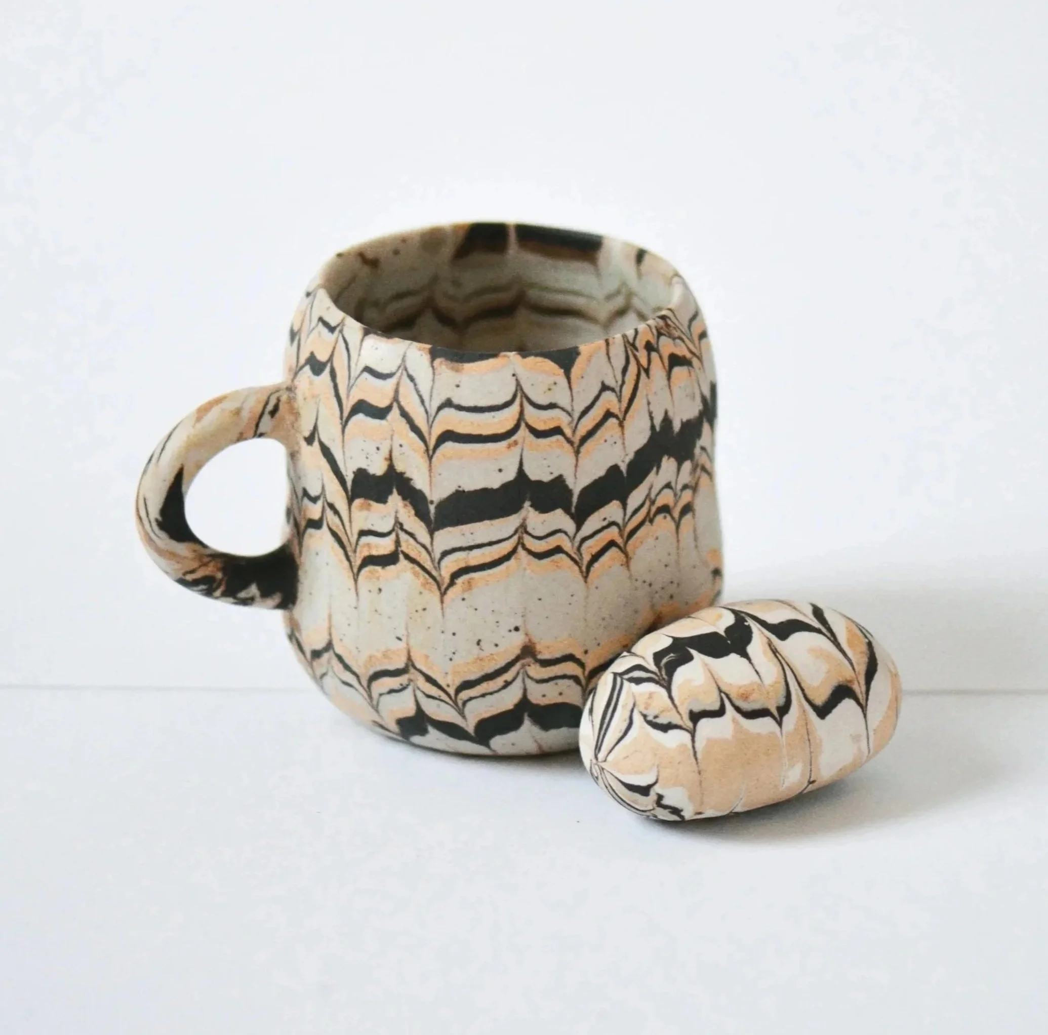 ‘Patchwork’, Tasse & et son accompagnement sous forme de galet, Grès - couleurs naturelles, terres mêlées, travail à la plaque, cuisson électrique 1250 °C, 10cm x 8cm, 2025, photo Cynthia Nge